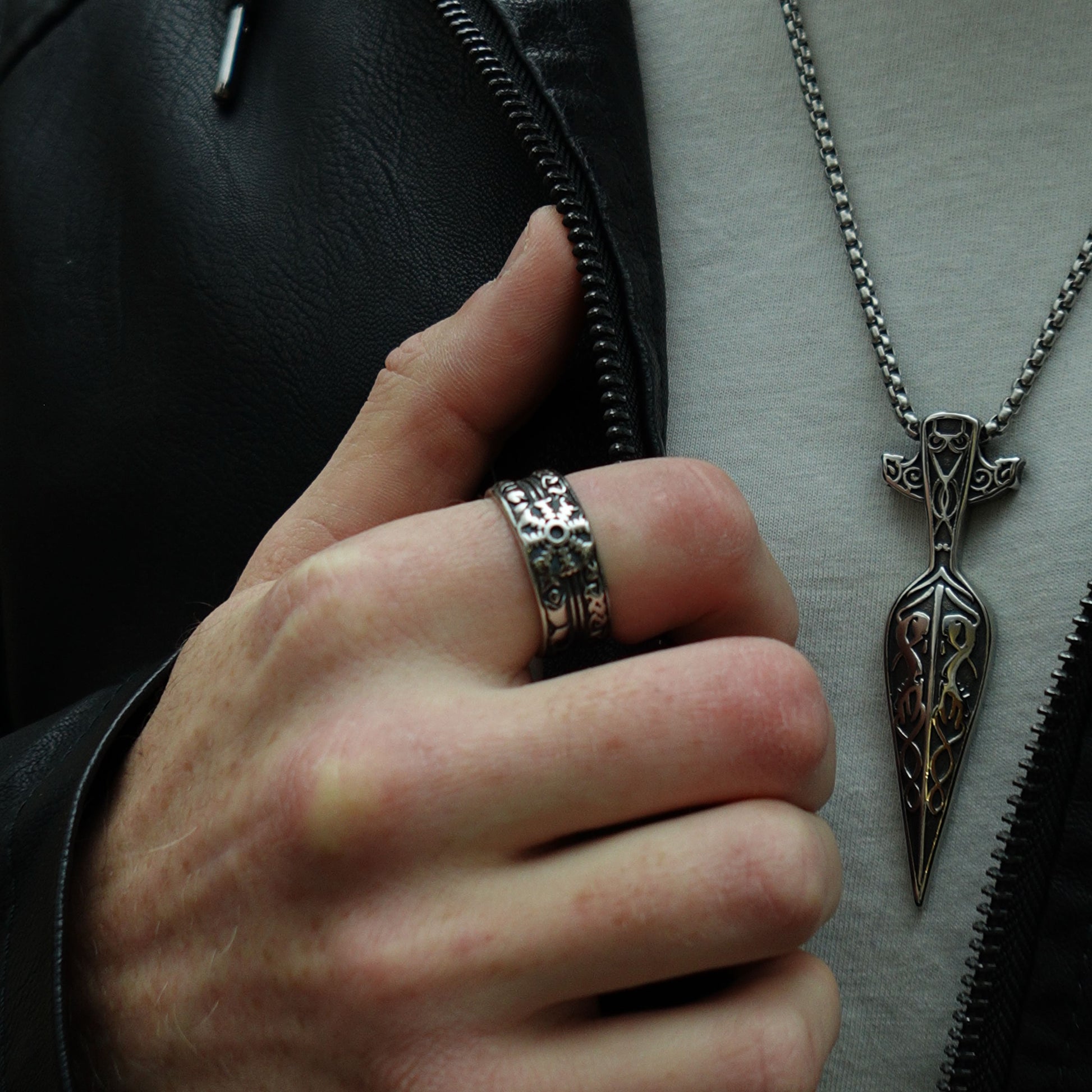 Forjado en acero quirúrgico, este anillo porta el Ægishjálmur, símbolo vikingo de protección y poder mental. Usado por los antiguos guerreros para infundir temor y resguardarse del peligro, hoy es un talismán que recuerda que la verdadera defensa nace de la fuerza interior.