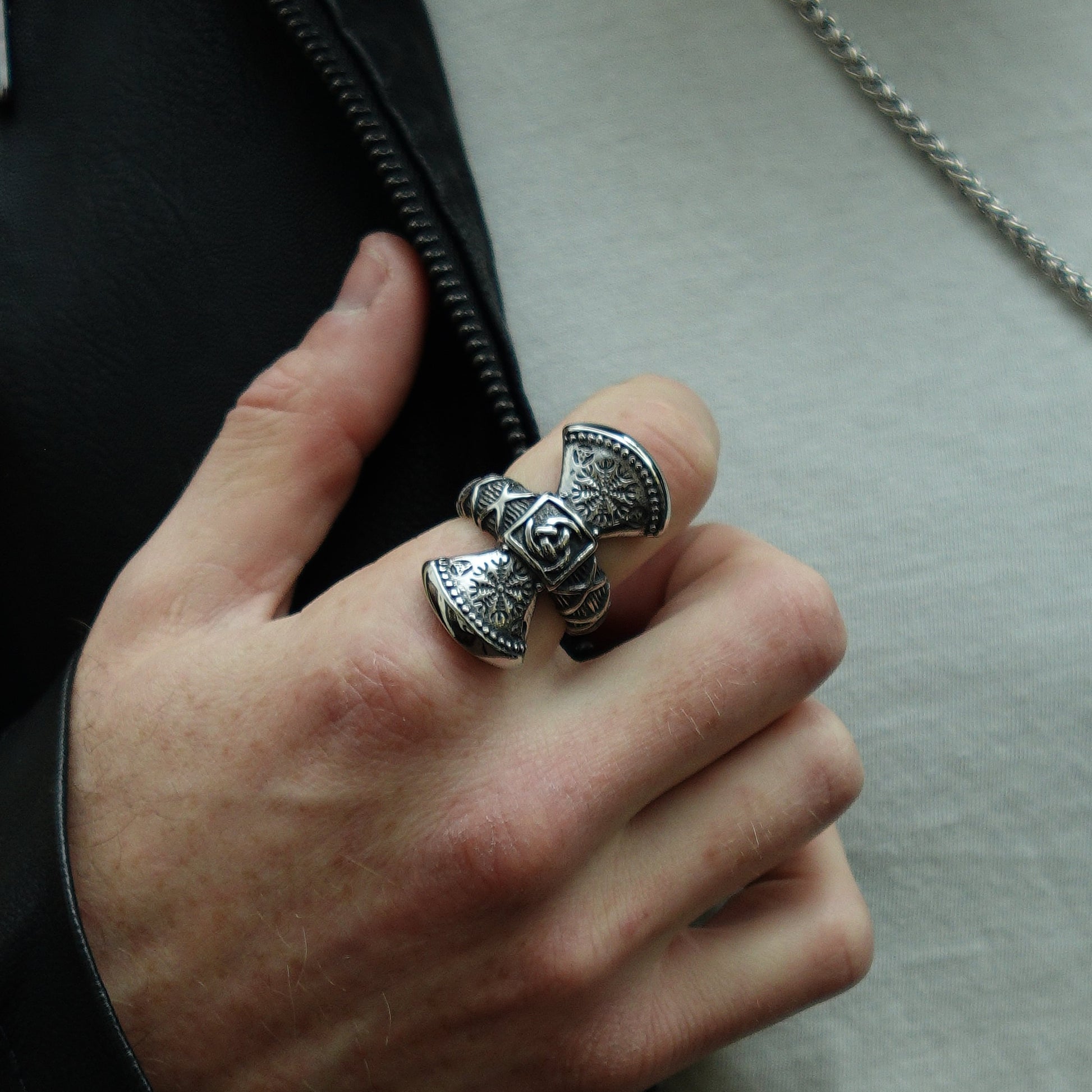 Este audaz anillo tiene la forma de un hacha de doble filo, un símbolo de fuerza, protección y espíritu guerrero en la tradición nórdica. El hacha está intrincadamente decorada con el Aegishjalmur, el Yelmo de Awe, un poderoso símbolo protector nórdico que se creía inspiraba temor en los enemigos y valentía en quien lo portaba. En el centro, un emblema de Trisquel refuerza su conexión con el equilibrio cósmico y los ciclos de la vida. Fabricado con materiales de alta calidad, el anillo combina durabilidad y simbolismo antiguo, honrando el legado vikingo de fuerza y protección. Un accesorio impactante para quienes admiran la mitología nórdica y el camino del guerrero.