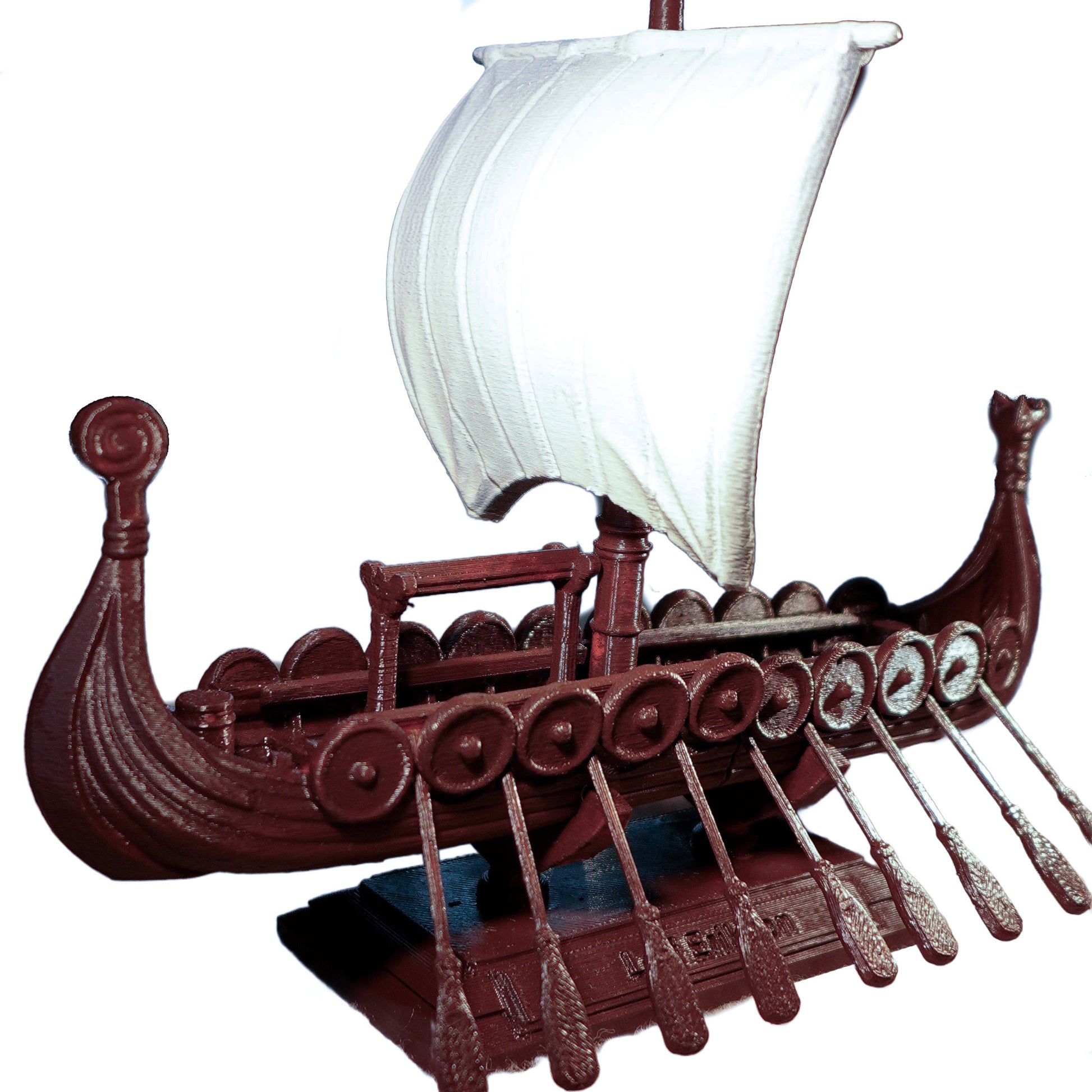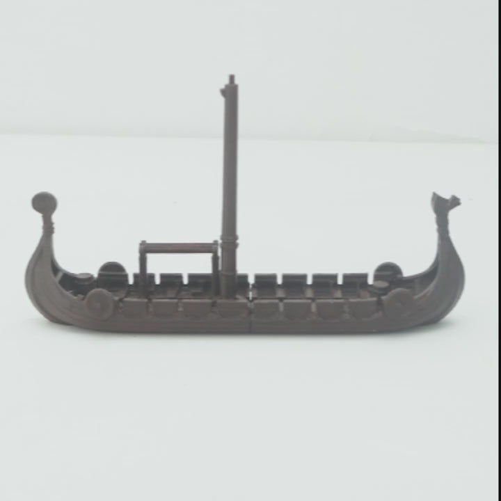 Surcá los mares del norte desde tu casa con este espectacular drakkar vikingo de 19 cm, pintado a mano en marrón oscuro con detalles en blanco que resaltan su vela y escudos, lleno de remos y tallados que lo hacen único y resistente; en su base lleva grabados los nombres “Drakkar” y “Leif Erickson”, perfecto para decorar escritorios, estantes o cualquier rincón y darle un aire épico y aventurero a tu espacio.