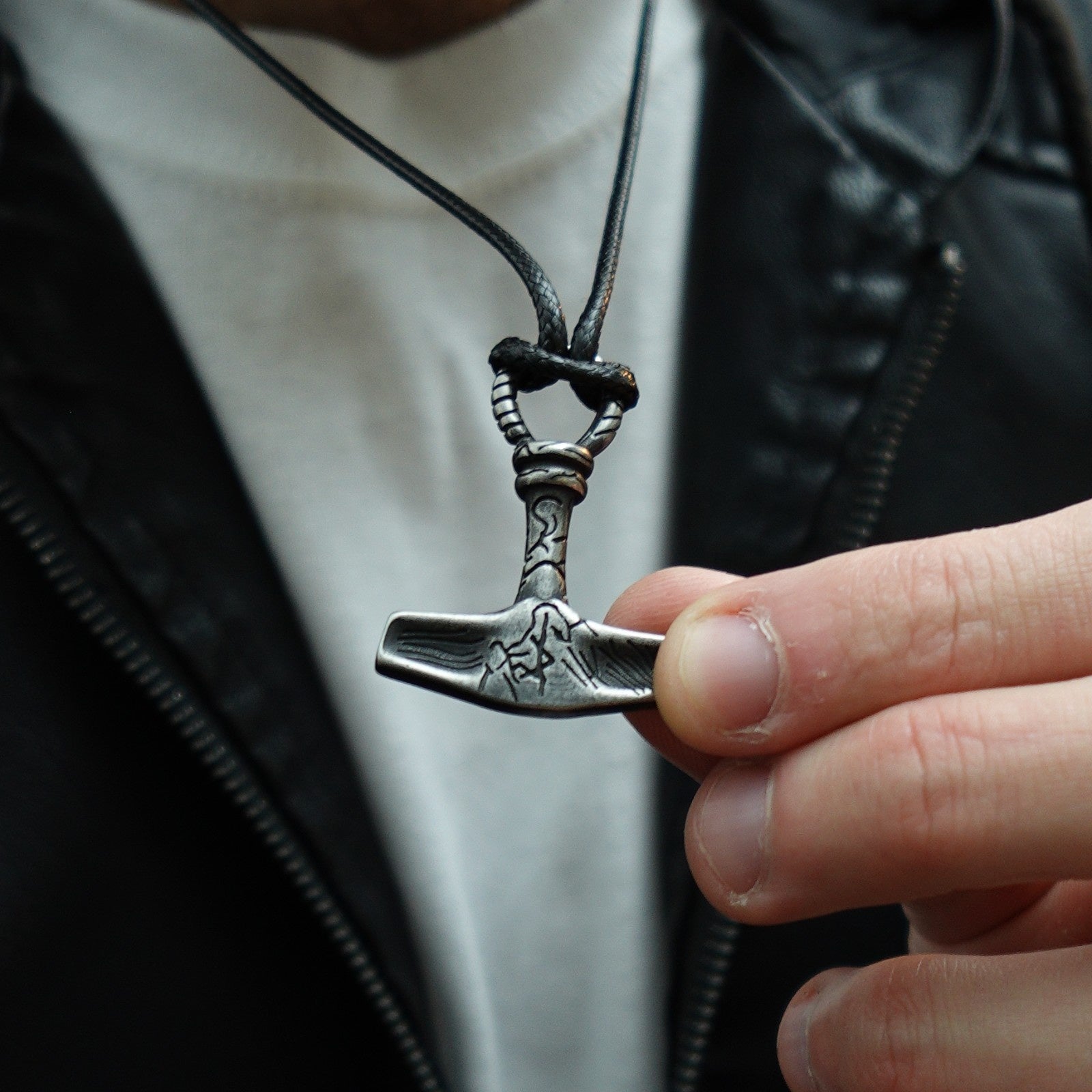 Mjölnir Sombrío es un collar minimalista con un cordón de cuero sintético y un martillo de Thor en gris oscuro como pieza central. Mjölnir, el arma de Thor, simboliza la protección, la fuerza y el poder para superar el caos. Su diseño sencillo resalta su significado atemporal, conectando al portador con la resiliencia y la fortaleza duradera de la mitología nórdica. El cordón de cuero sintético agrega un toque moderno, ofreciendo durabilidad y comodidad sin restar autenticidad a sus raíces antiguas. Esta pieza es ideal para quienes buscan una conexión sutil pero profunda con la herencia vikinga y el poder protector de Thor.