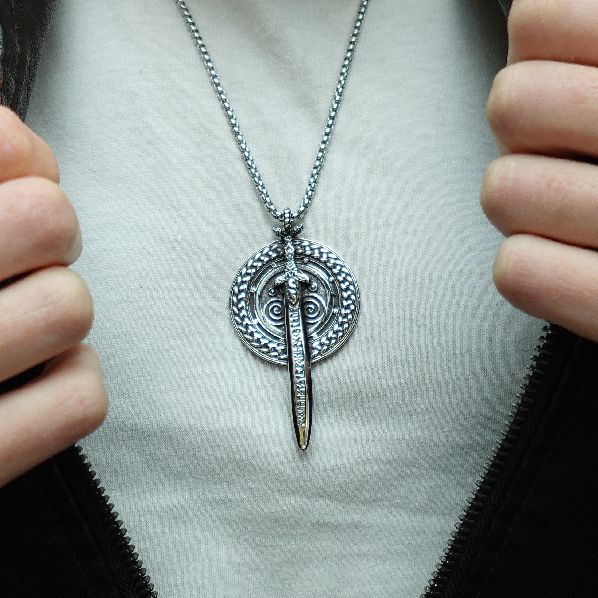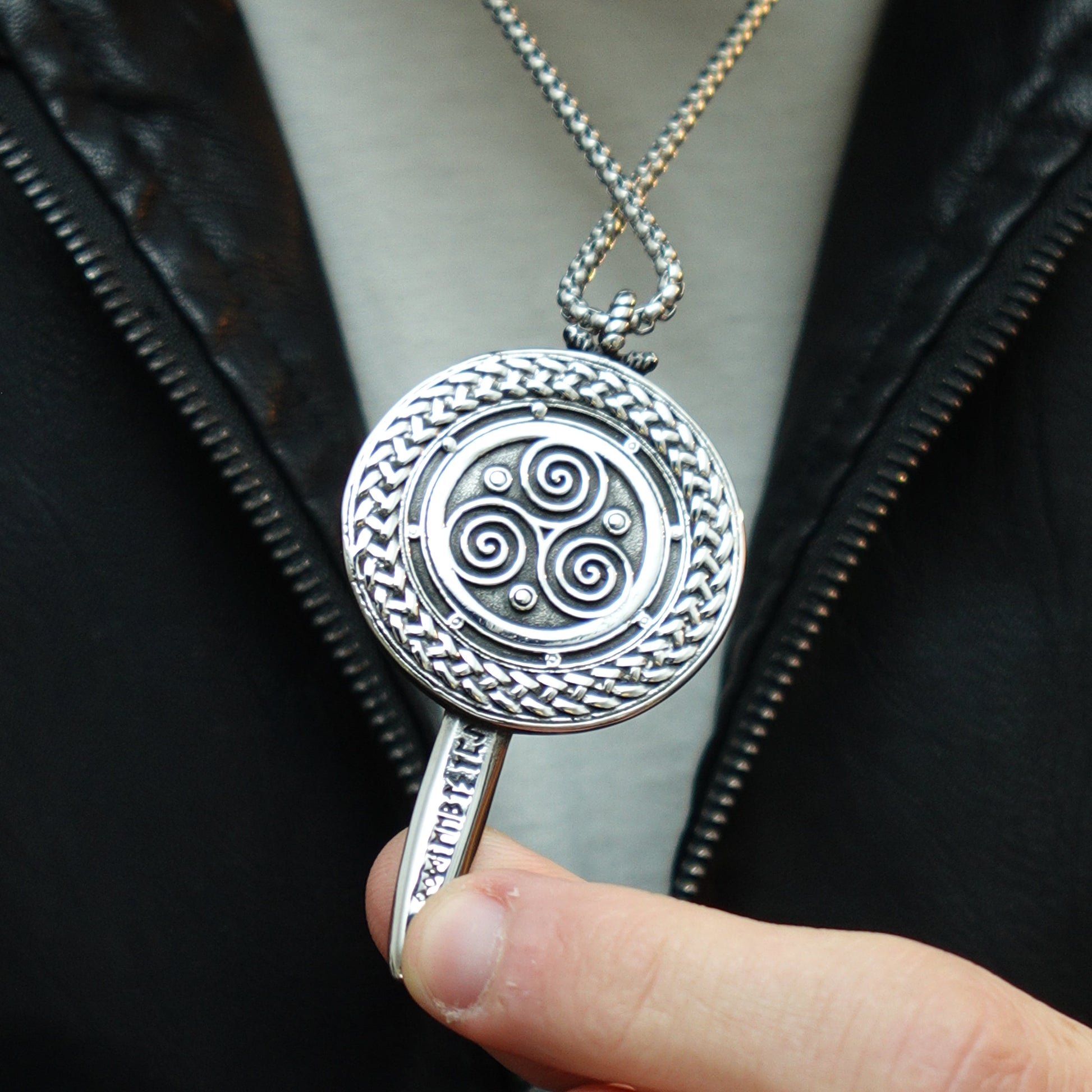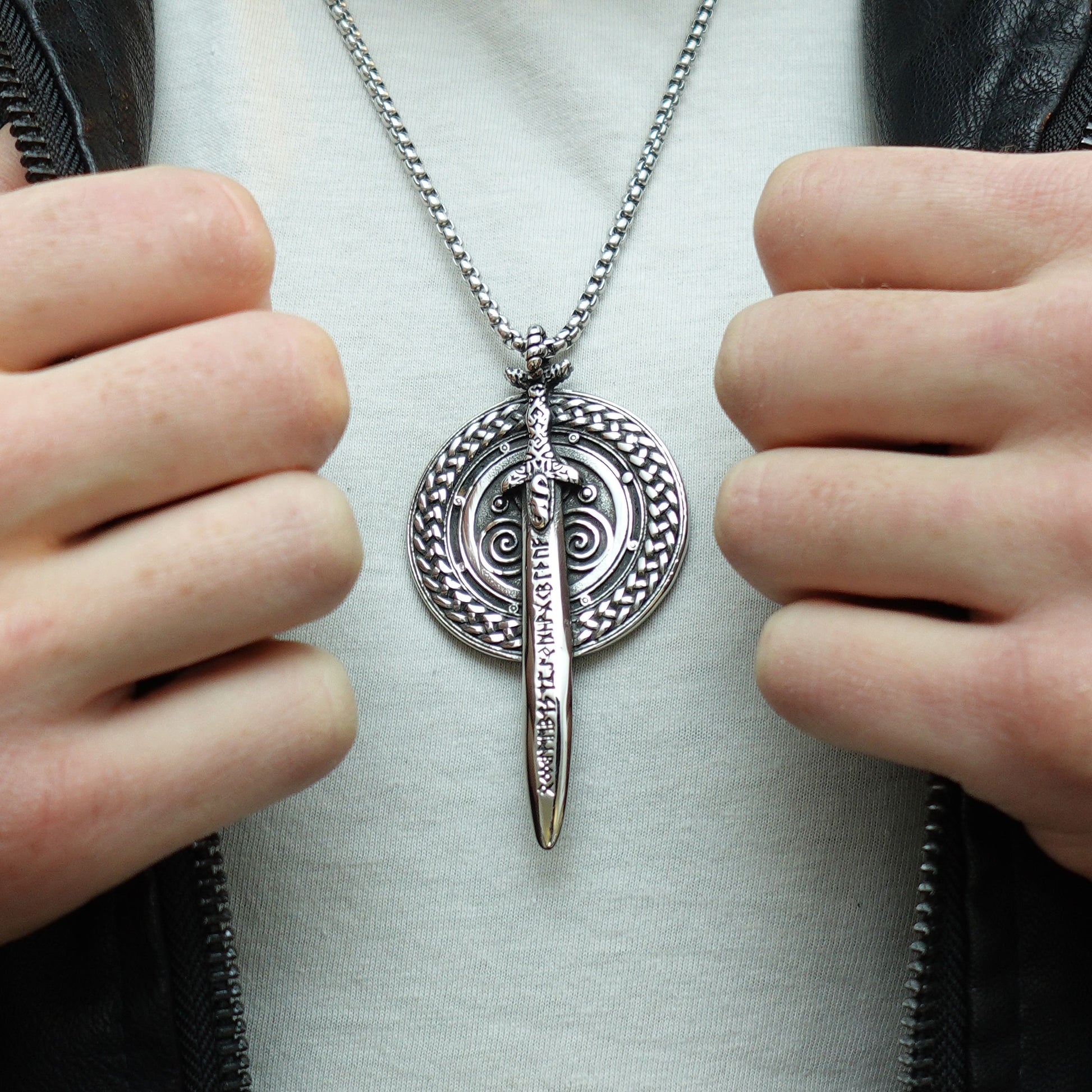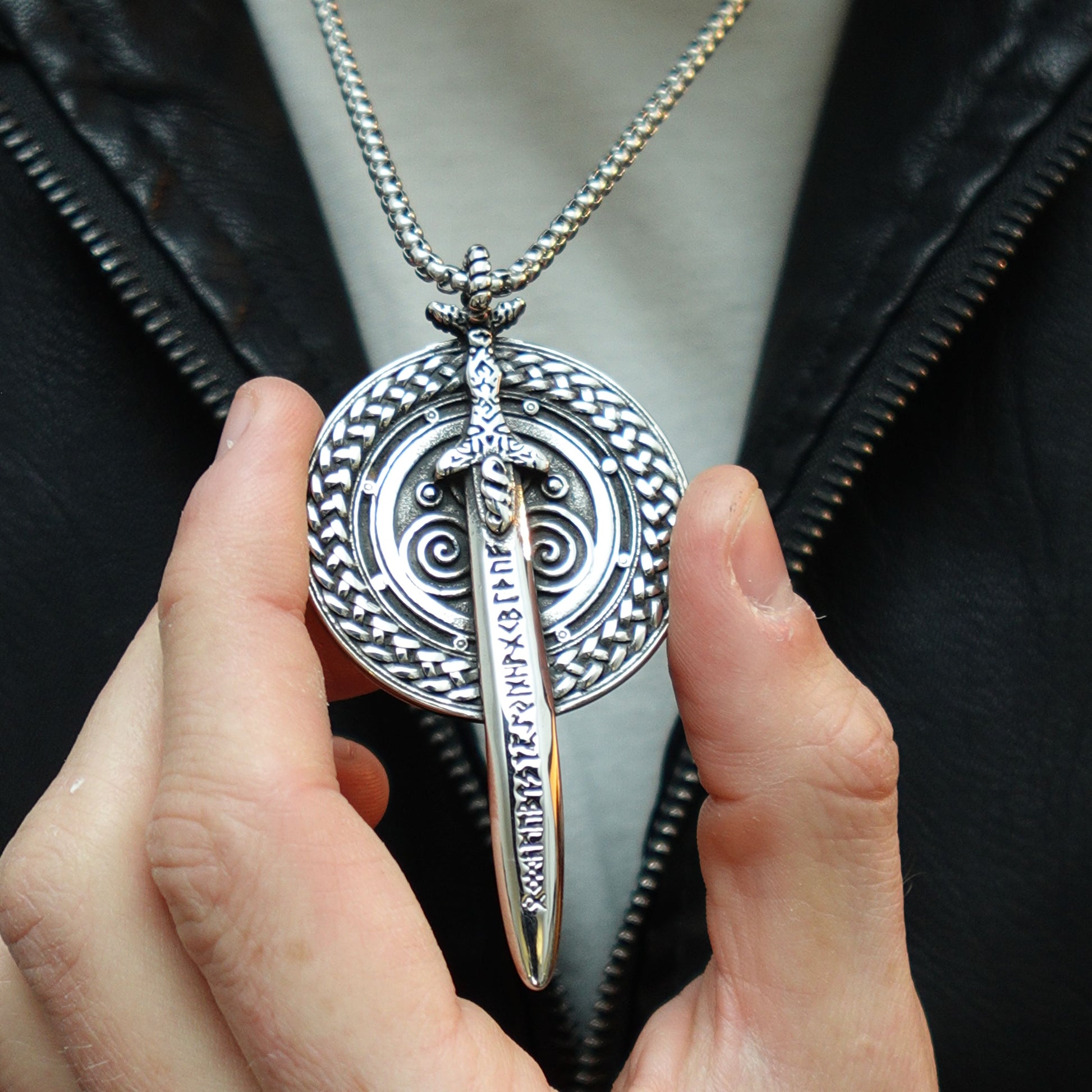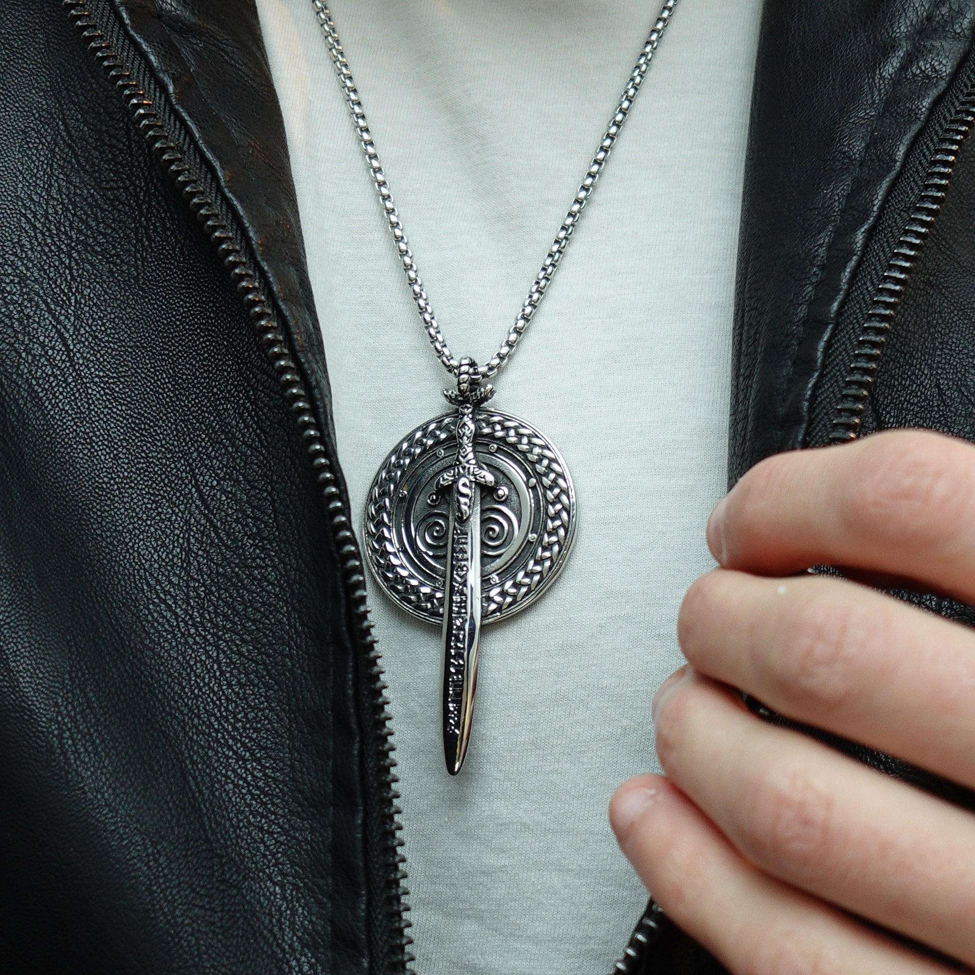 El Colgante Escudo y Espada es un impresionante collar de acero inoxidable que presenta un escudo circular decorado con intrincados nudos y patrones en espiral, acompañado por una espada en posición vertical. La hoja está grabada con runas, evocando la sabiduría y el poder de los antiguos guerreros nórdicos. El escudo simboliza la protección y la firmeza, mientras que la espada representa la fuerza y el coraje para enfrentar cualquier desafío. Juntos, estos elementos encarnan la dualidad de defensa y ataque, cualidades esenciales de un guerrero vikingo. Este colgante es un impactante homenaje al honor y la resiliencia de la era vikinga.