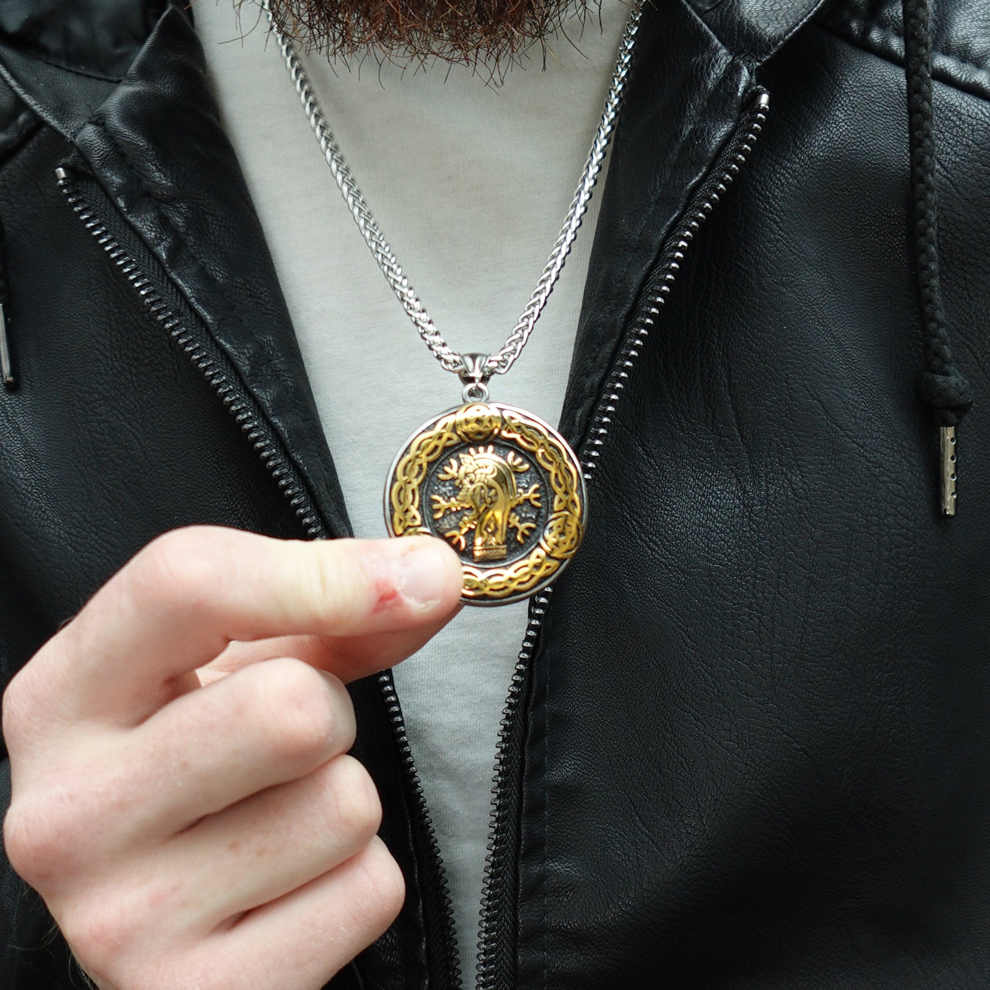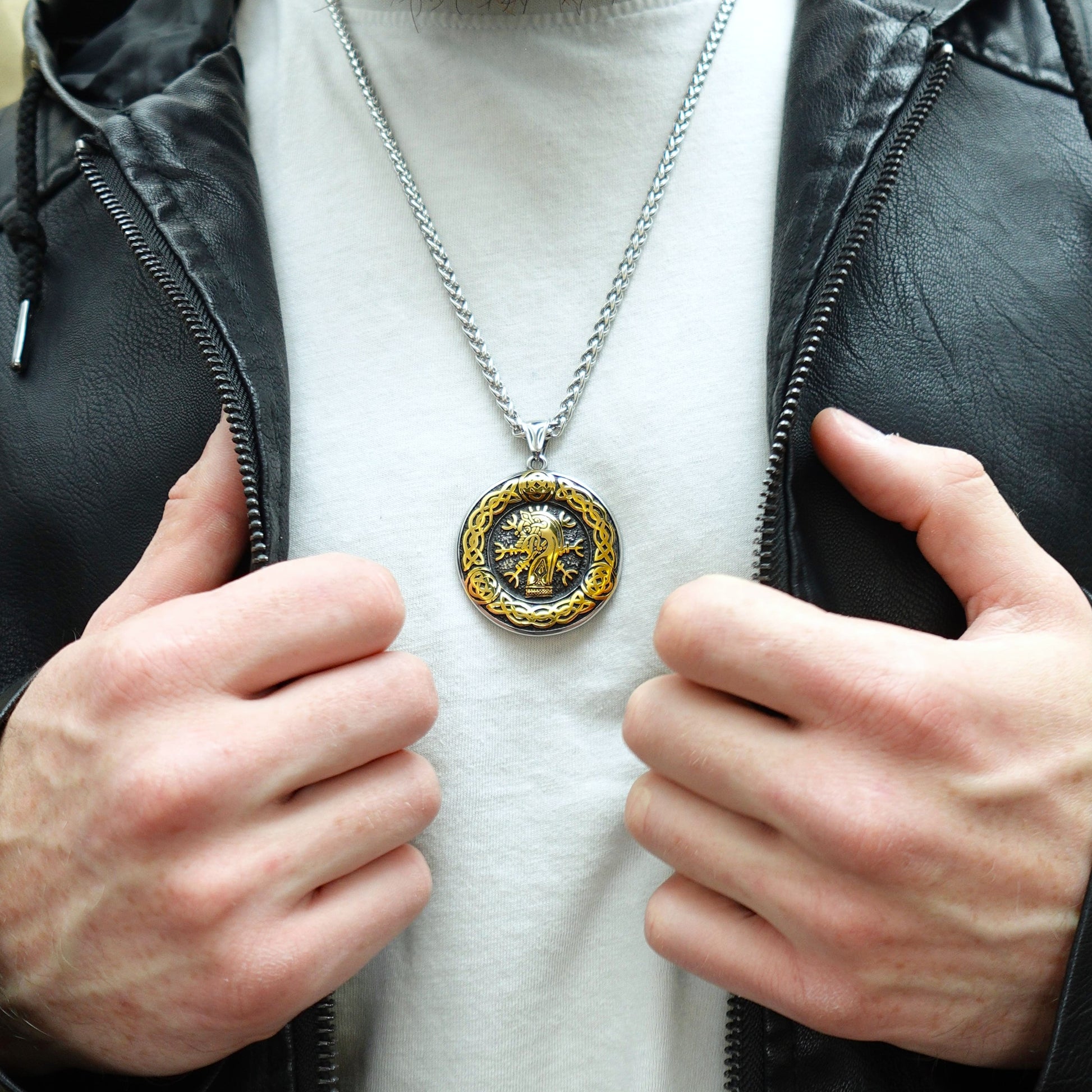 Hecho con precisión en acero quirúrgico de alta calidad y bañado en oro 18k, este collar es duradero y simboliza la resistencia. Al llevarlo, te envuelve en una mezcla única de protección mitológica y elegancia atemporal. Sumérgete en la riqueza de la mitología nórdica con esta joya que no solo adorna, sino también protege con el encanto ancestral de Aegishjalmur y la majestuosidad de Yggdrasil.