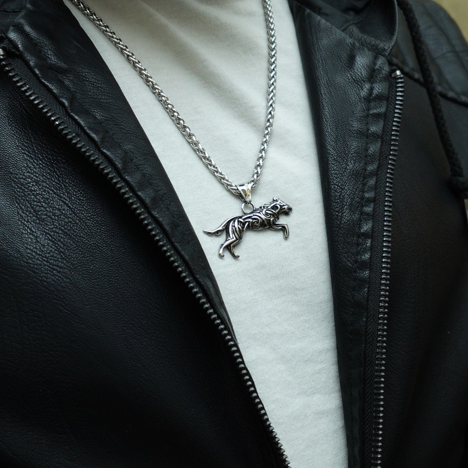 Presentamos el "Collar Bestia Libre": Una obra maestra en acero quirúrgico que captura la esencia de Fenrir cuando se libera de las cadenas. En el dije de 4x2 cm, un lobo corre con fuerza, simbolizando la liberación y la feroz independencia de la bestia nórdica.