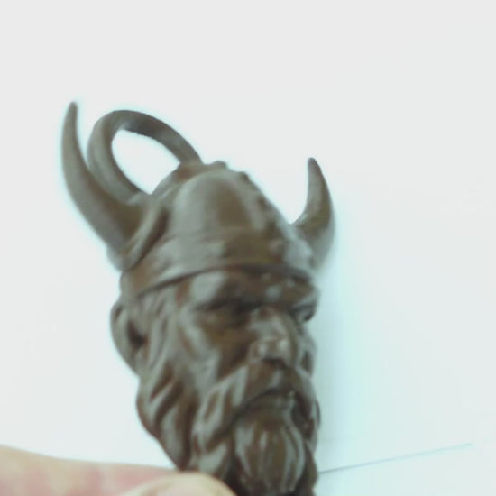 Cabeza de vikingo decorativa impresa en 3D y pintada a mano, con anillo superior para colgar en pared o puerta. Diseño con cuernos y barba, inspirado en la estética vikinga. Pieza artesanal ideal para puertas de madera o decoración temática.