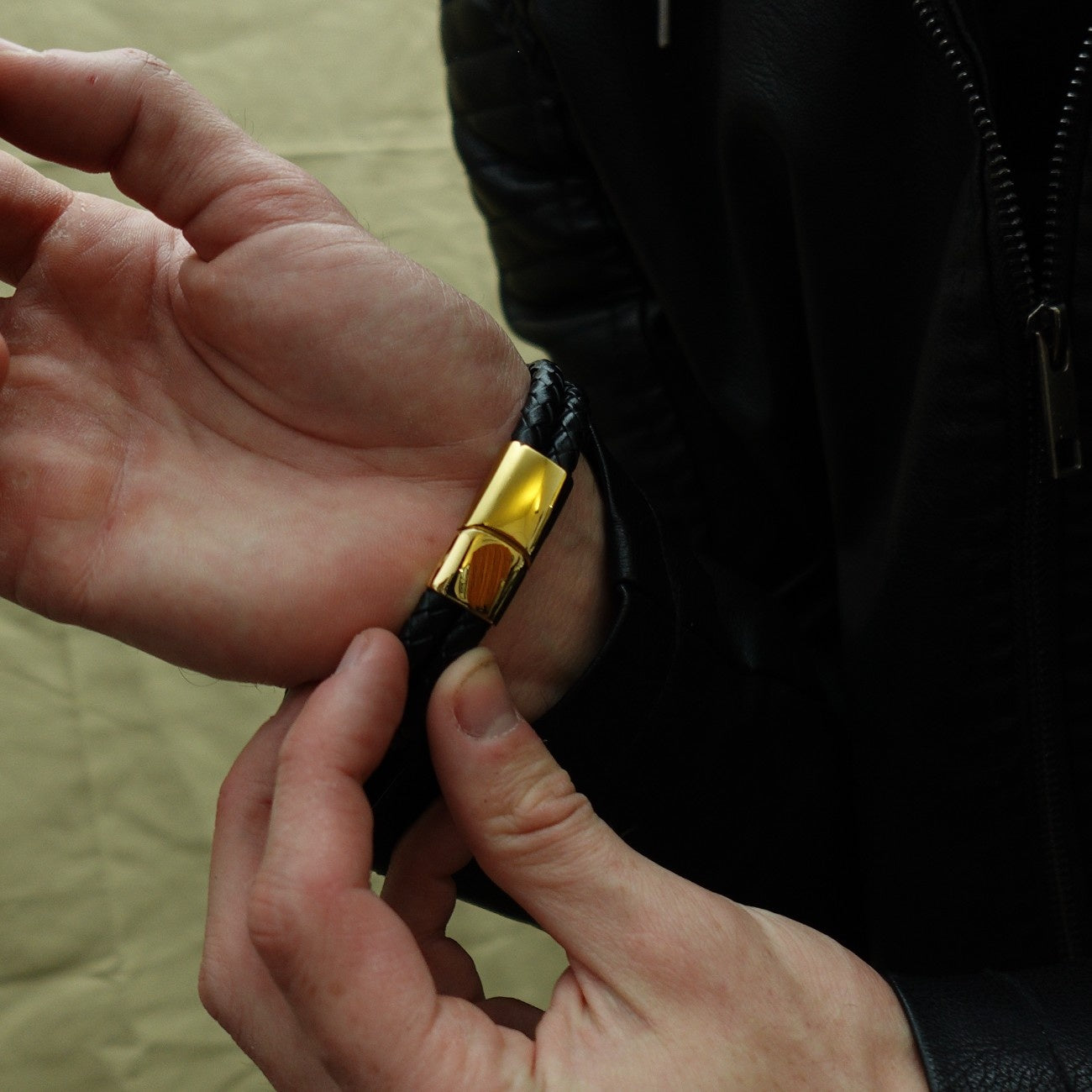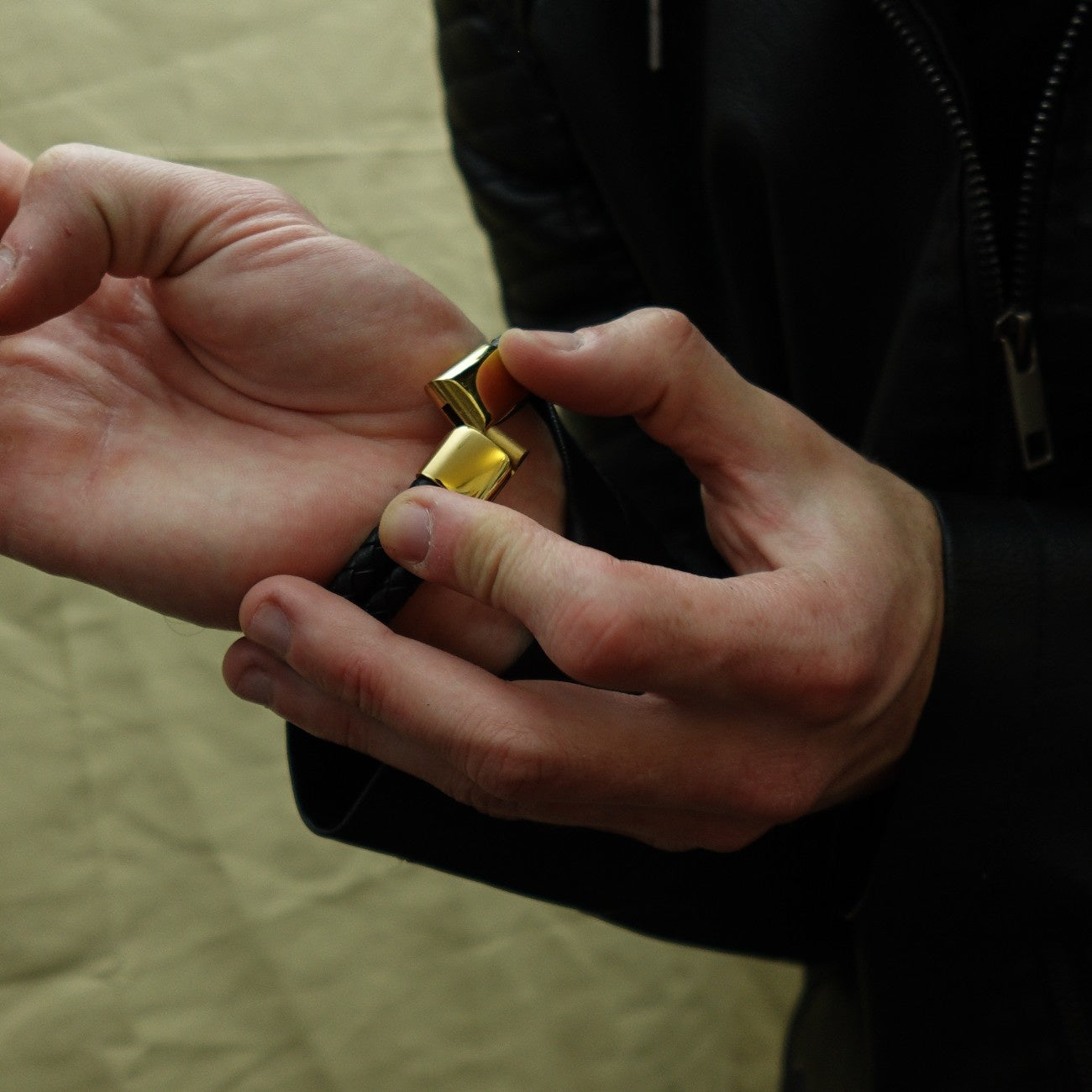 El cuero negro trenzado sostiene con firmeza al águila, un detalle que no pasa desapercibido y que transforma cualquier atuendo en una declaración de carácter. Es más que una pulsera: es un talismán que acompaña a los que eligen su propio destino.